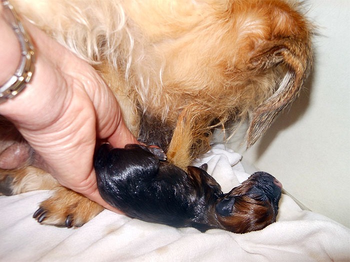 Ook niet aan de pup trekken als na een persstoot de pup er nog niet helemaal is. Bij de volgende stoten komt hij vanzelf. Het spreekt vanzelf dat als een pup werkelijk in de vulva-opening blijft steken en u ziet de teef geen persbewegingen meer maken, u heel voorzichtig de pup een beetje naar buiten probeert te masseren en zachtjes, heel zachtjes, wat trekt. Nooit aan de staart naar buiten trekken In de eerste plaats maakt u dan de vliezen kapot, in de tweede plaats kunnen de zenuwbanen in de staartwerveltjes zo ernstig beschadigd raken, dat een deel van het staartje de eerste dagen na de geboorte afsterft.