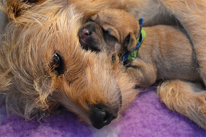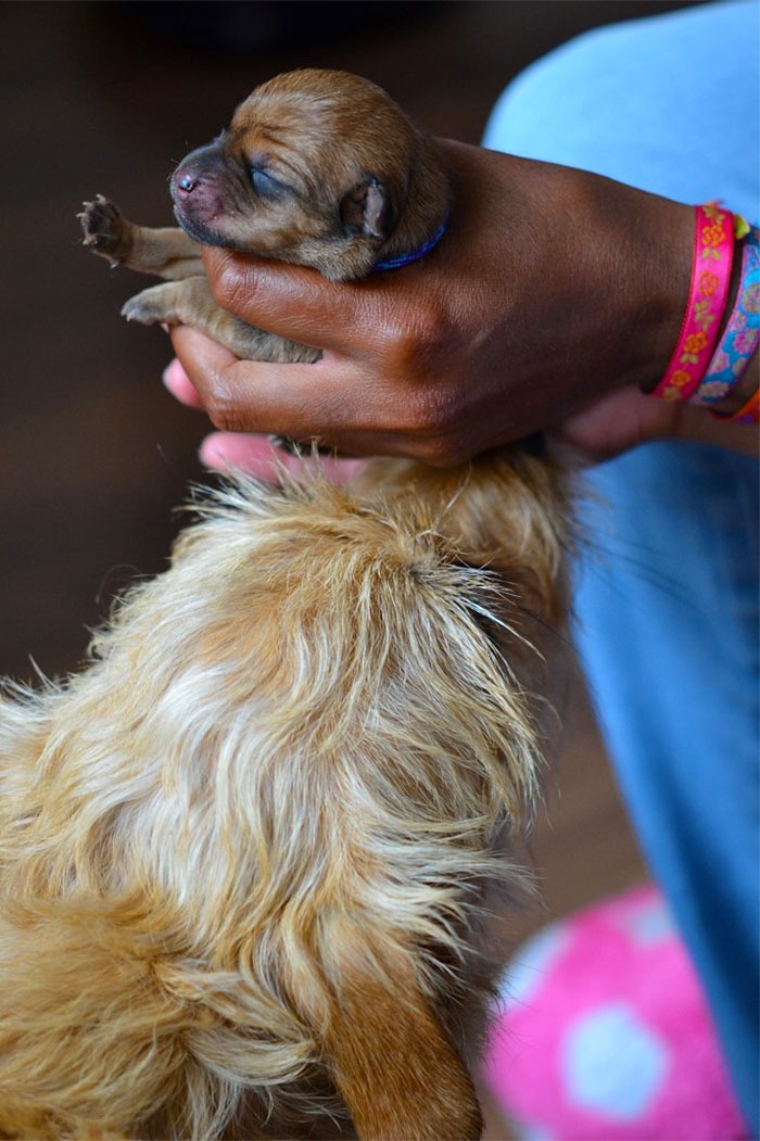 Een teef die voor de eerste keer bevalt, kan schrikken van de bewegingen en geluiden van de pup. Ze kan de pup zelfs oppakken en proberen te begraven. Let hierbij op dat de pup geen wonden oploopt. Leg eventueel de eerste pup even apart in een warme omgeving. Na de geboorte van de tweede pup worden de meeste teven rustiger en gedragen zich als ervaren moeders. Leg de eerste pup zo snel mogelijk weer bij de moeder.