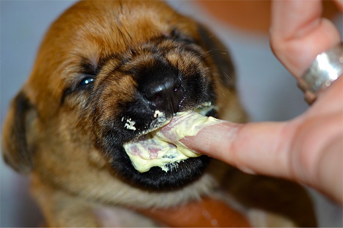 Zo vanaf de 23e dag kunt u de pups bij gaan voeren. Dit heet spenen. U begint ze de eerste twee of drie dagen alleen maar wat puppymelk te geven, zo wennen ze aan een andere manier van slikken en zuigen. Het veiligste is, om daarna volgens voorschrift op de verpakking van een goed merk puppyvoer te gaan voeren. Bouw het heel rustig op. Start met een klein beetje goed doorweekte brokken, zodat een brij ontstaat. Voer de hoeveelheid voedsel de komende dagen telkens een beetje op. Er zijn fokkers, die hun pups ’s morgens een bordje pap geven, bijvoorbeeld van Nutrix gemaakt. Maak die pap eerst van puppymelk, later van gewone volle melk.